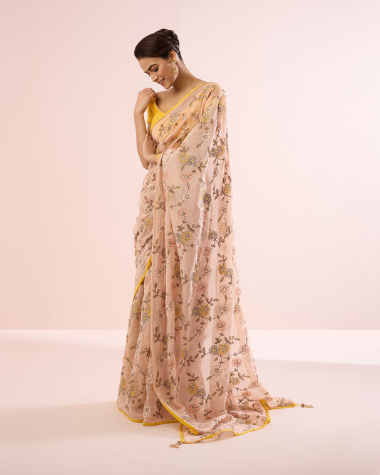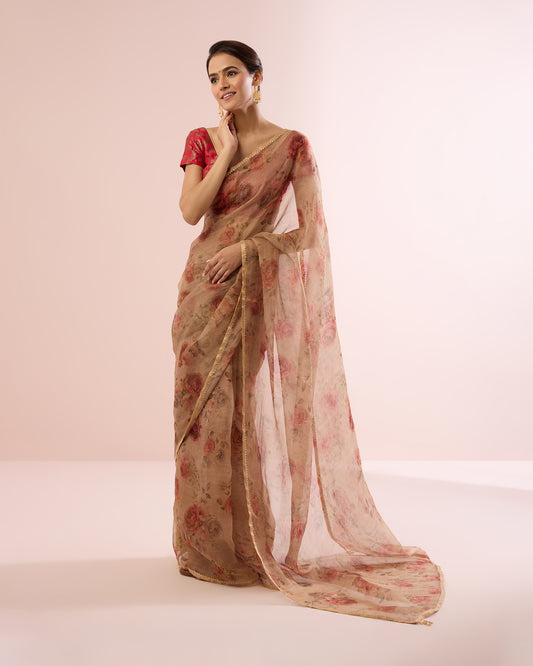 CABBAGE ROSE TISSUE CHANDERI SILK SAREE- BEIGE GOLD