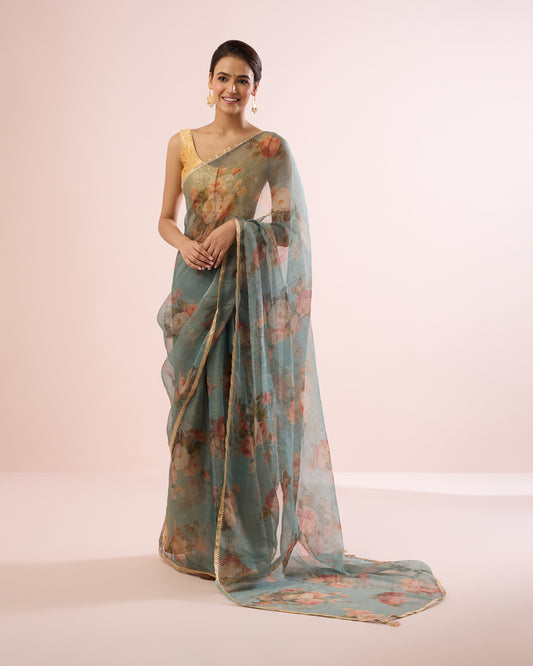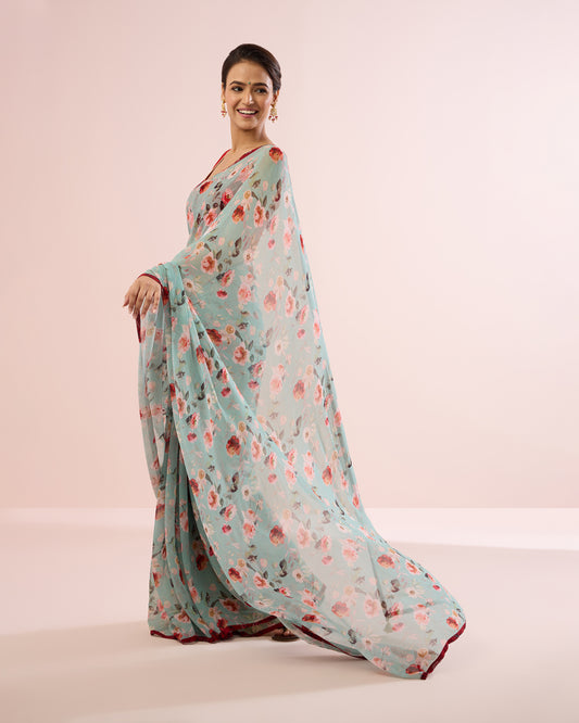 Sold outAQUA GERANIUM PRINTED CHIFFON SAREE