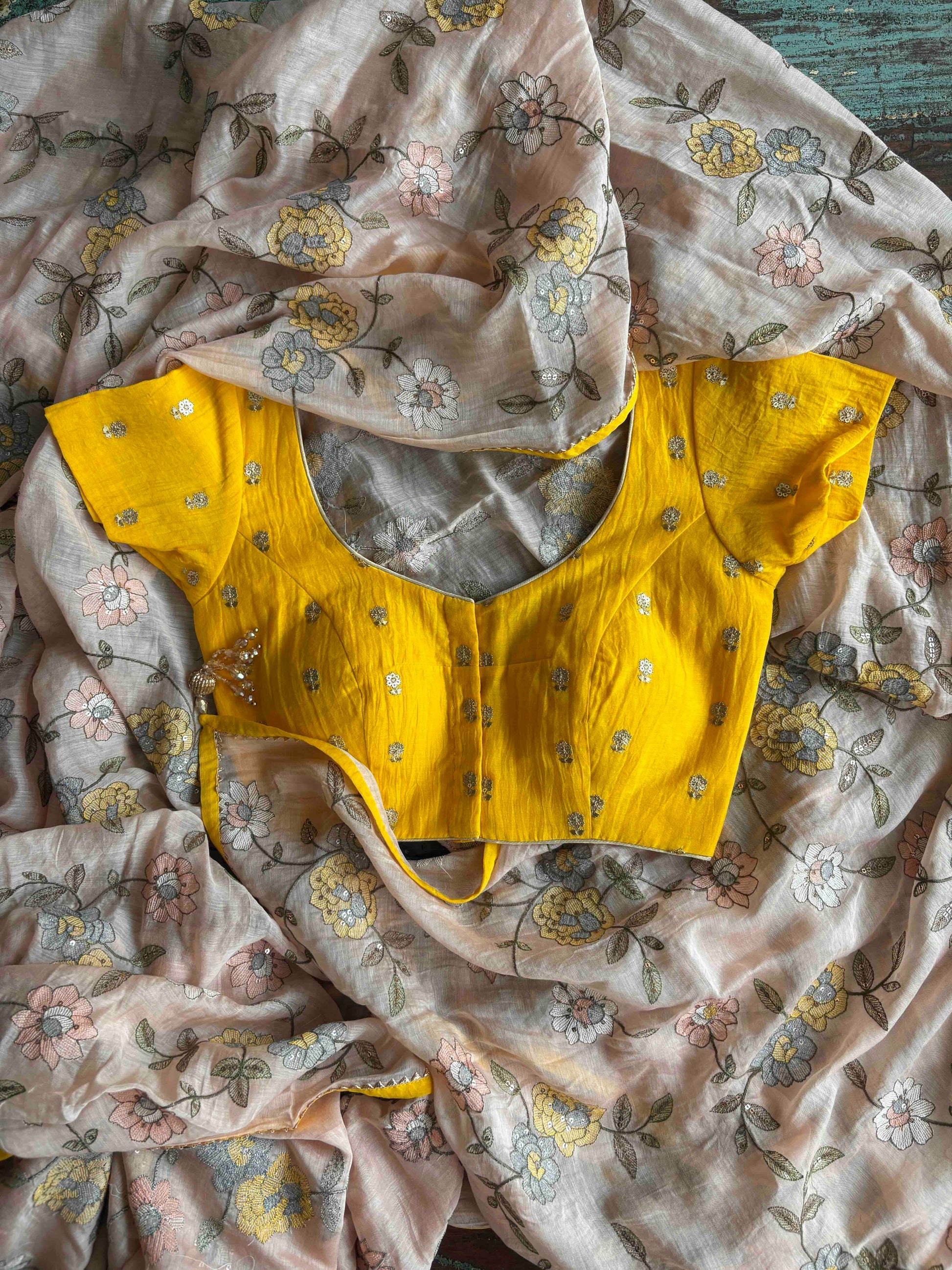 It is paired with a corn yellow embroidered Chanderi blouse fabric, detailed with tiny sequinned flowers, creating a contrasting yet harmonised palette that completes the ensemble with charm.