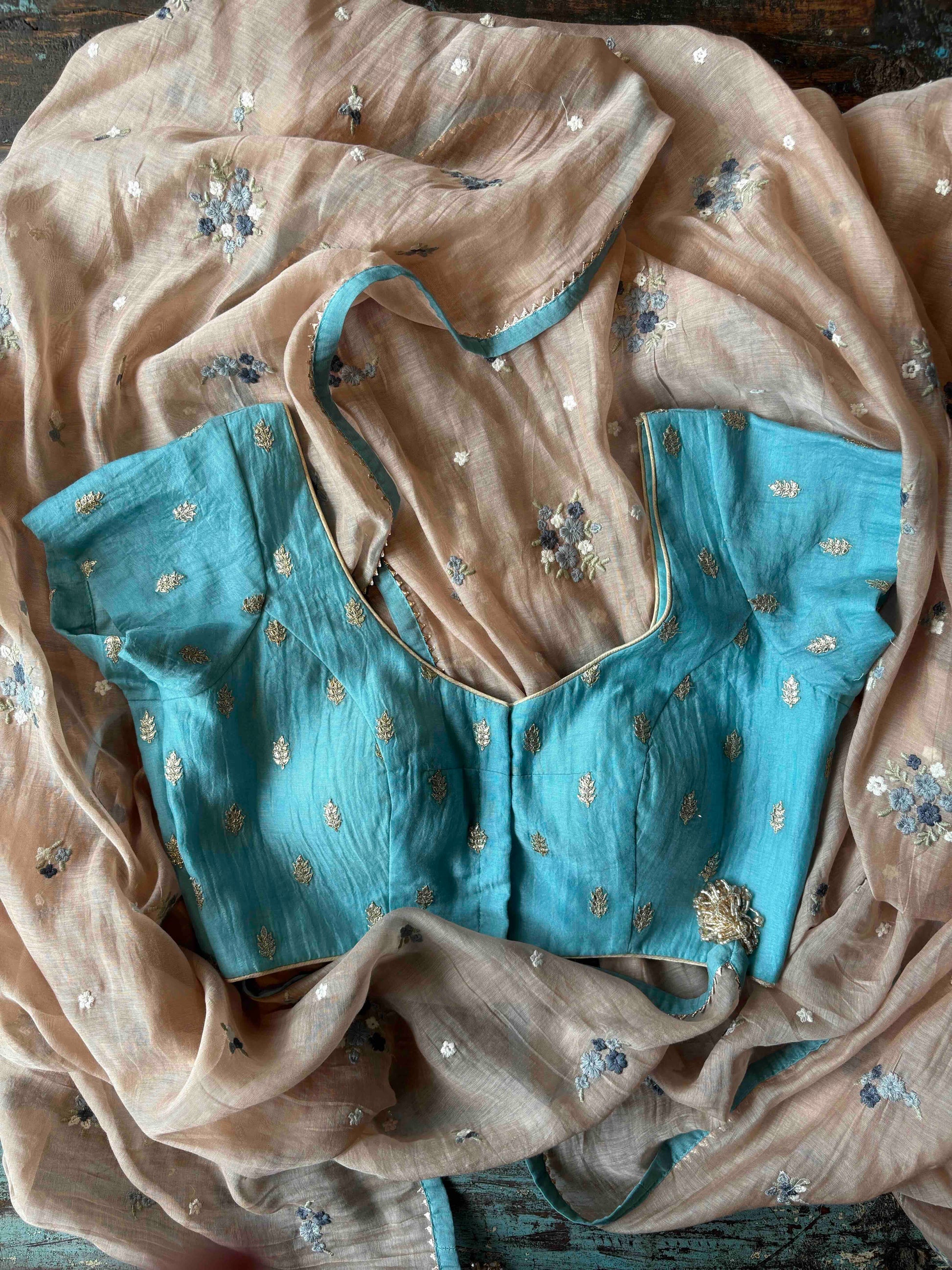 This piece is paired with a vintage turquoise blouse fabric in Chanderi, embroidered with tiny sequinned leaves. The colour contrast creates a fresh, sophisticated palette that feels both rooted and modern.