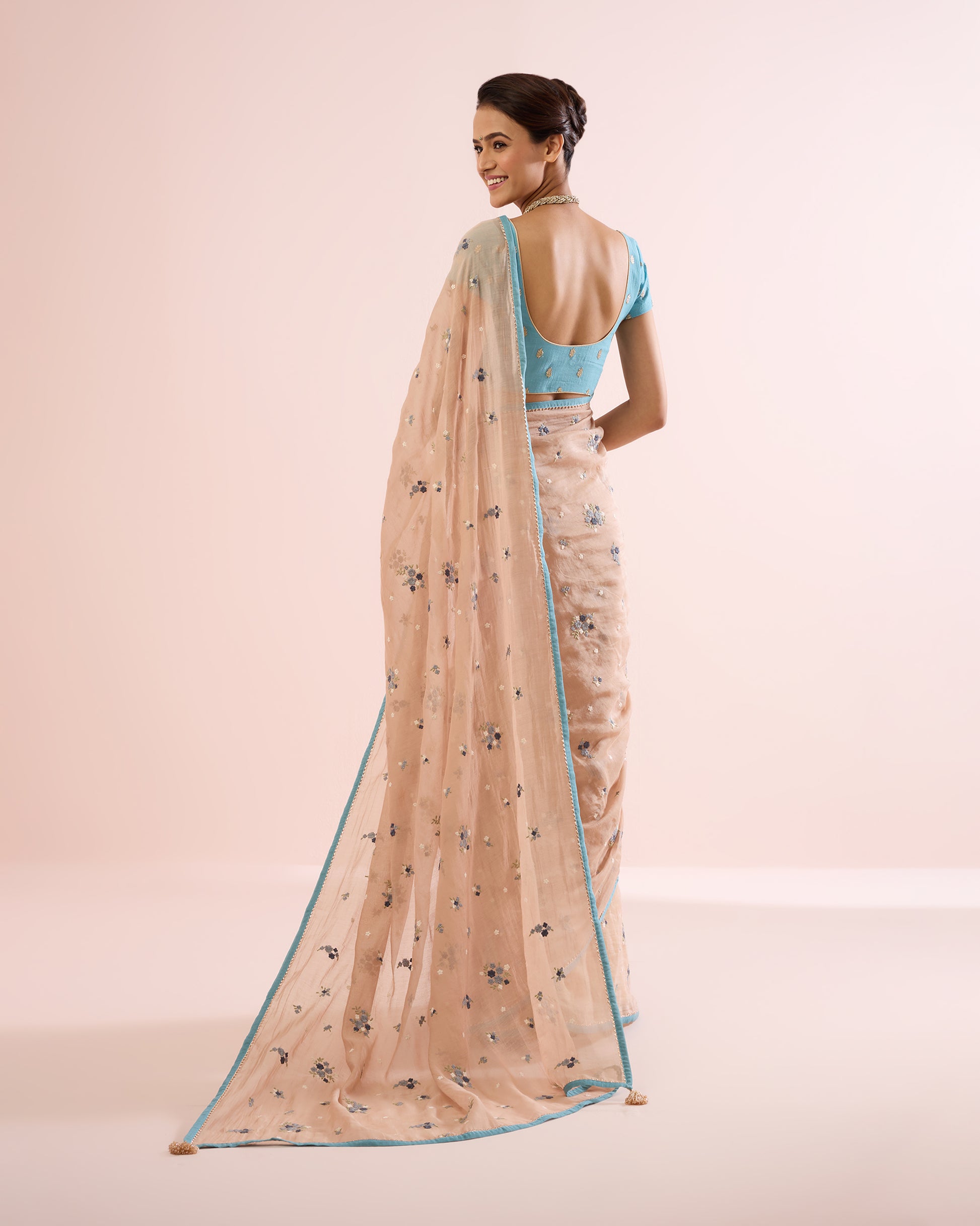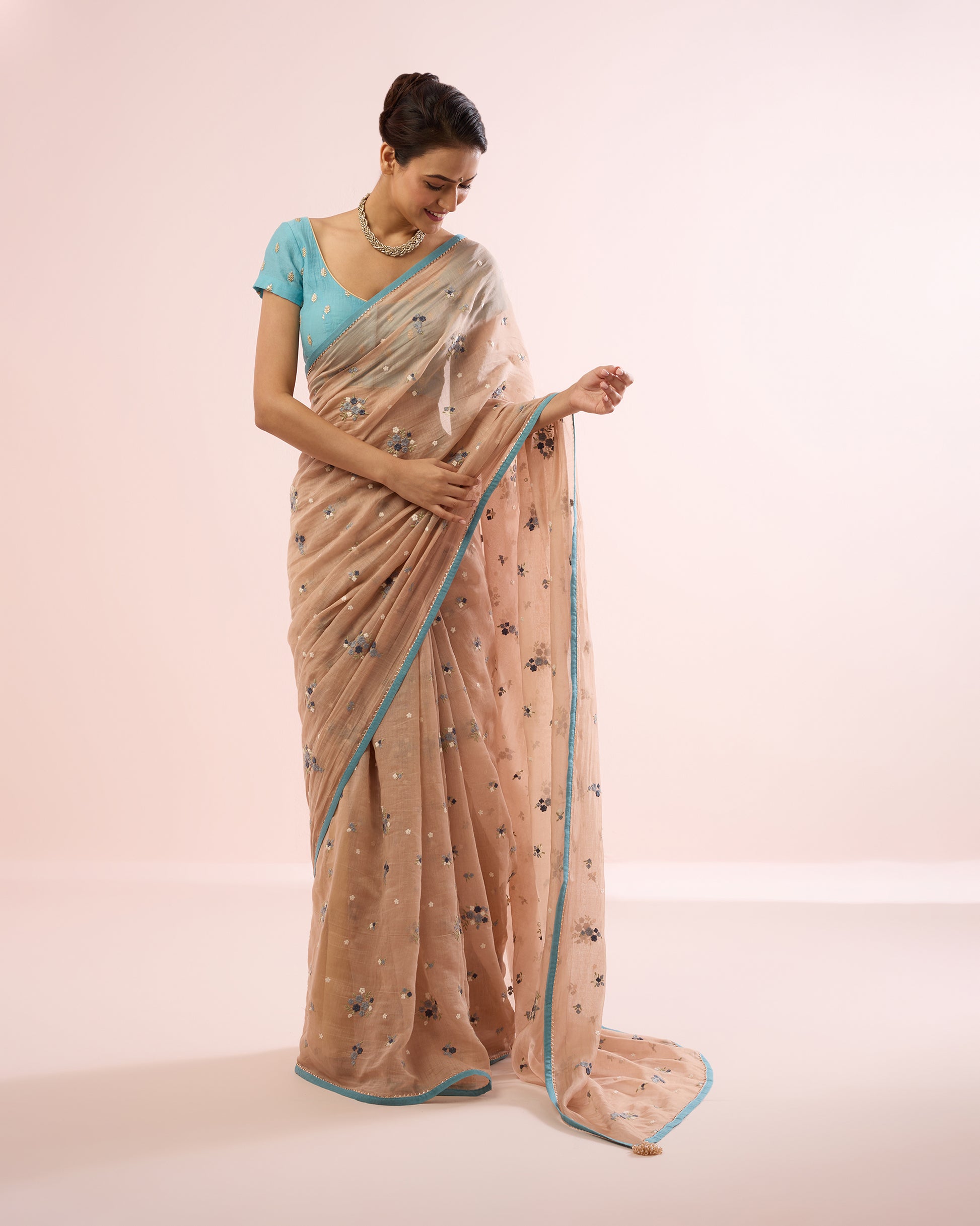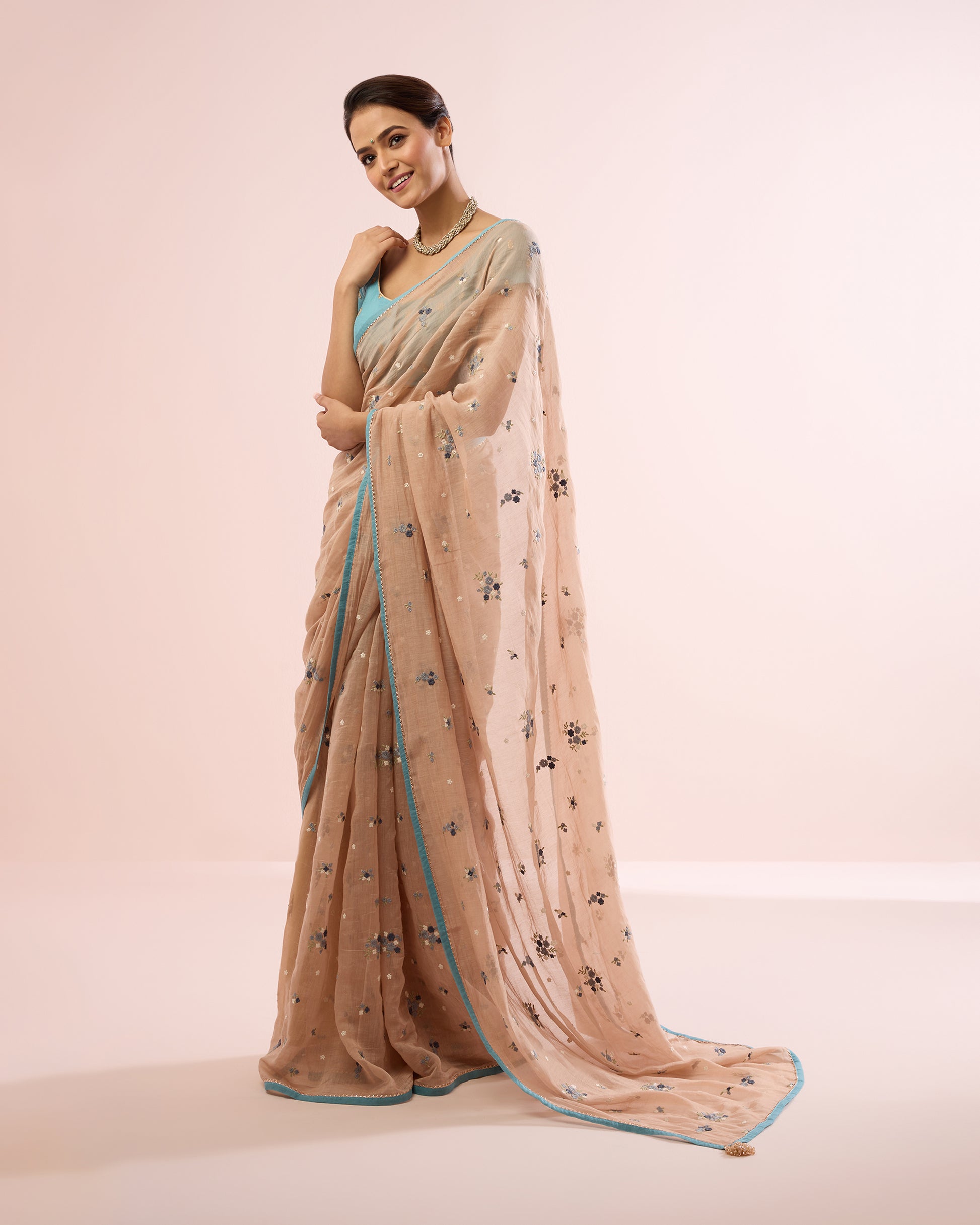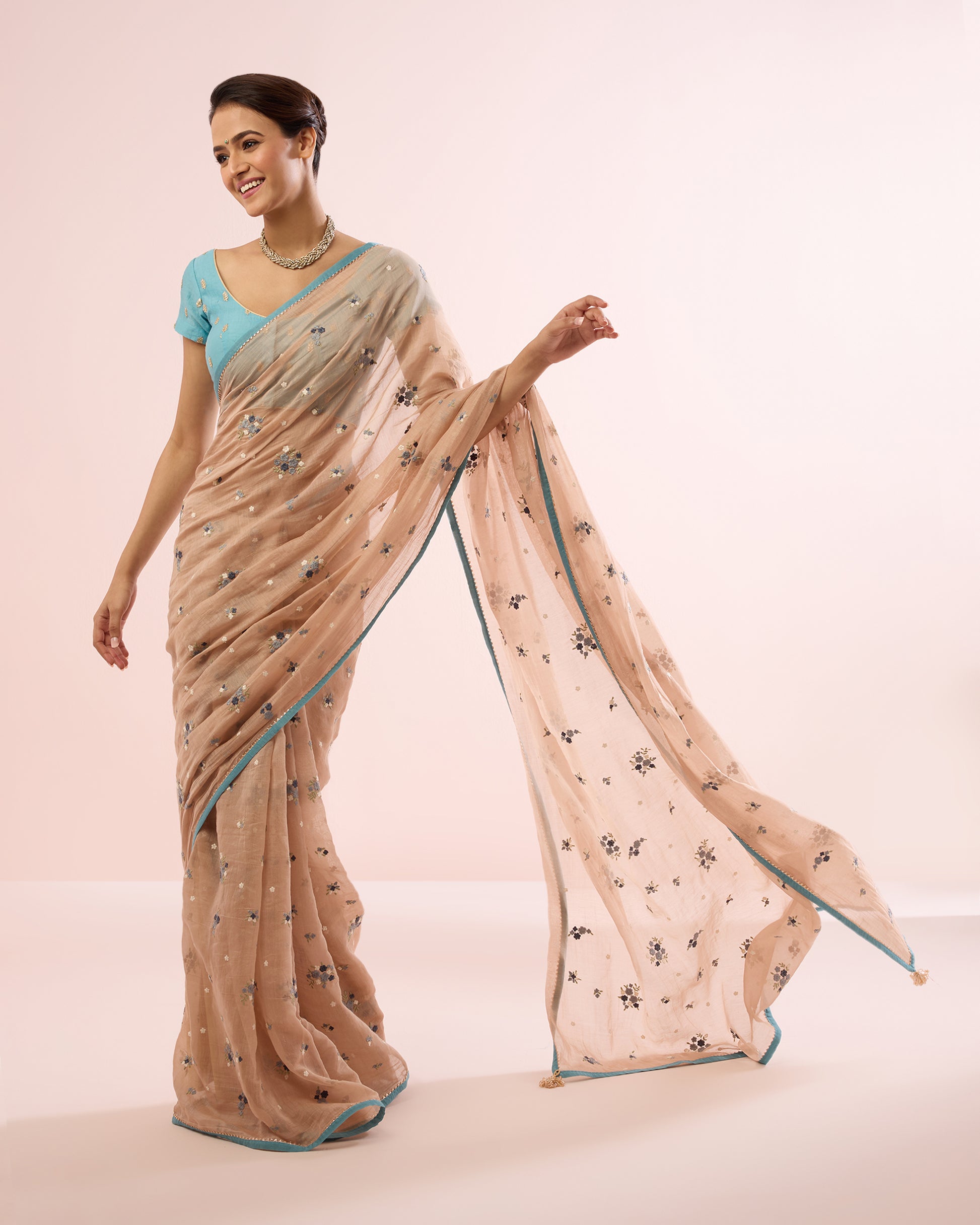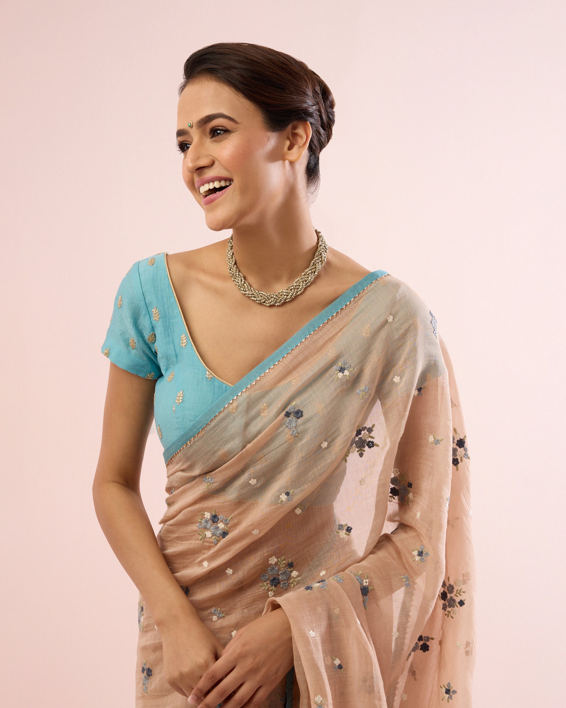 A delicate Mocha beige Chanderi silk saree, featuring exquisitely embroidered daisy clusters and leafy vines scattered across its body. The embroidery is done using colourful, fine threads that evoke a quiet nostalgia and bring the floral motifs to life in the most subtle way.