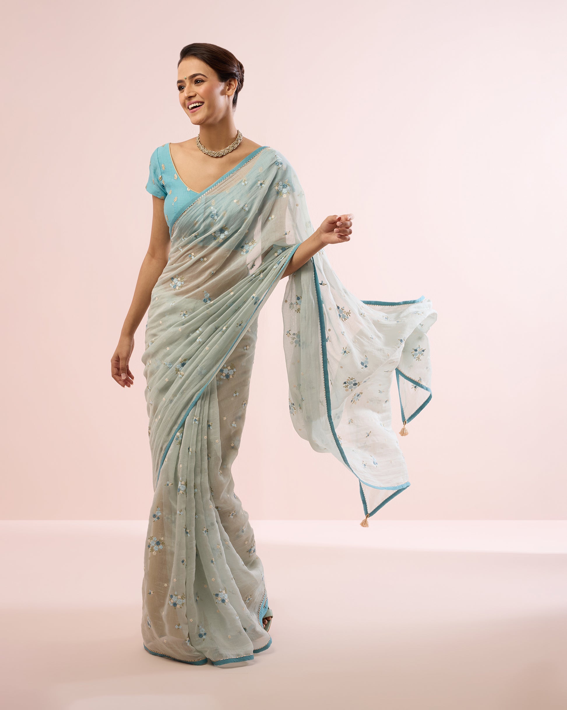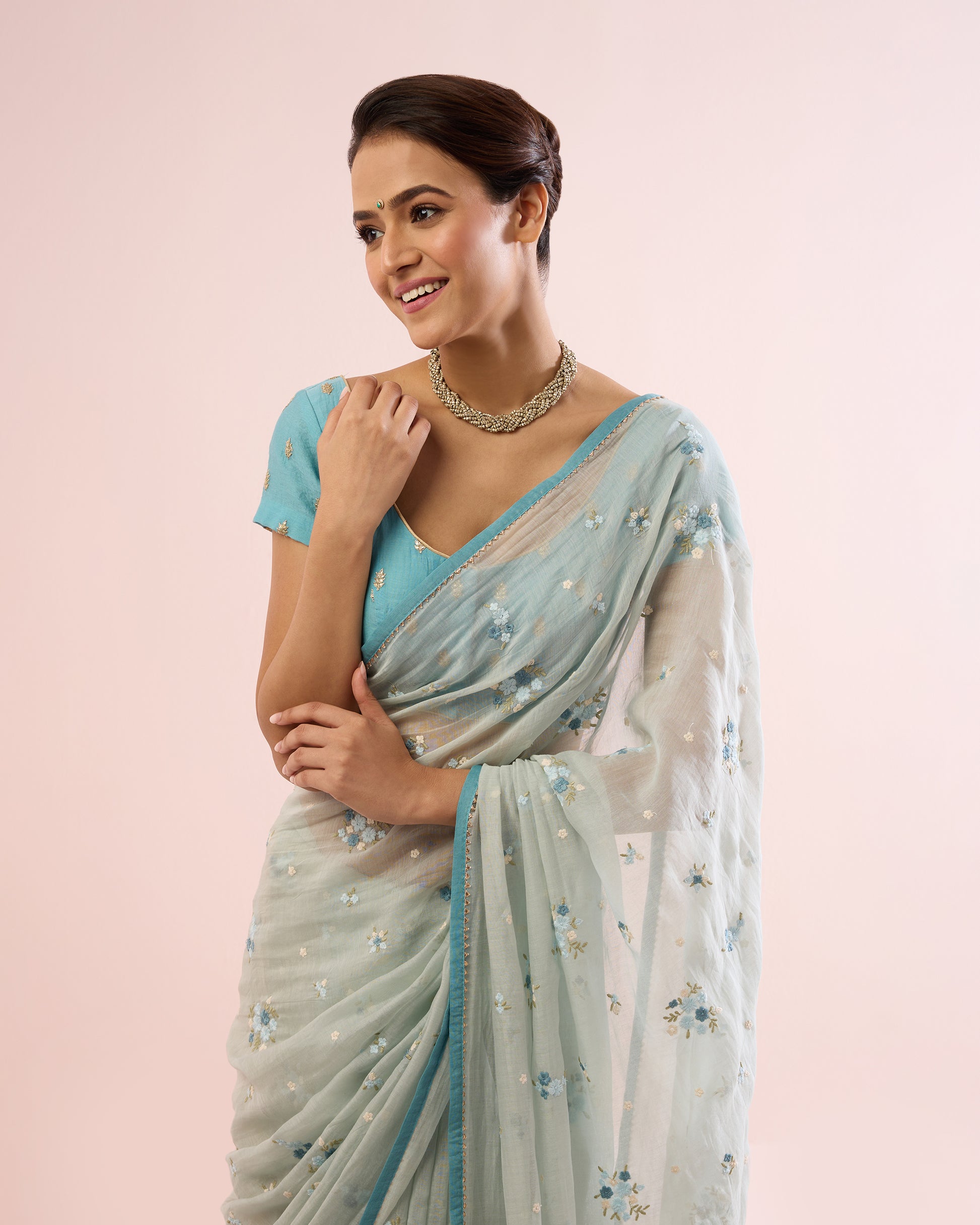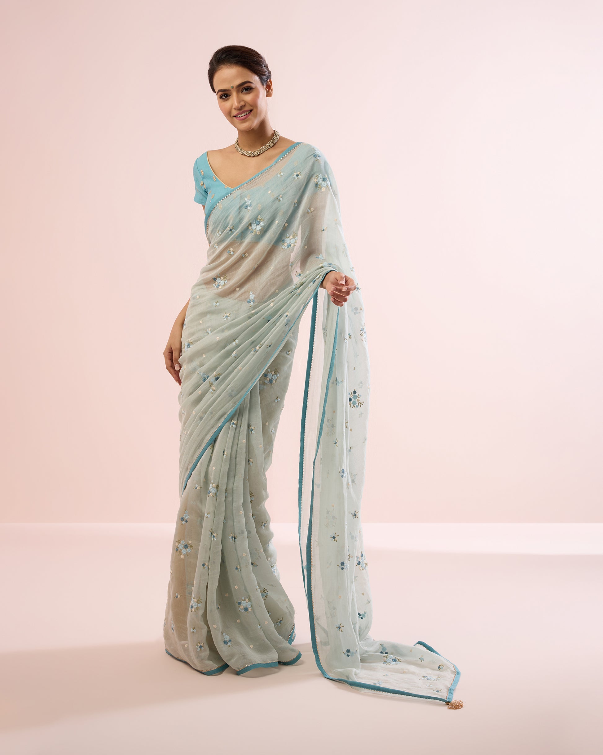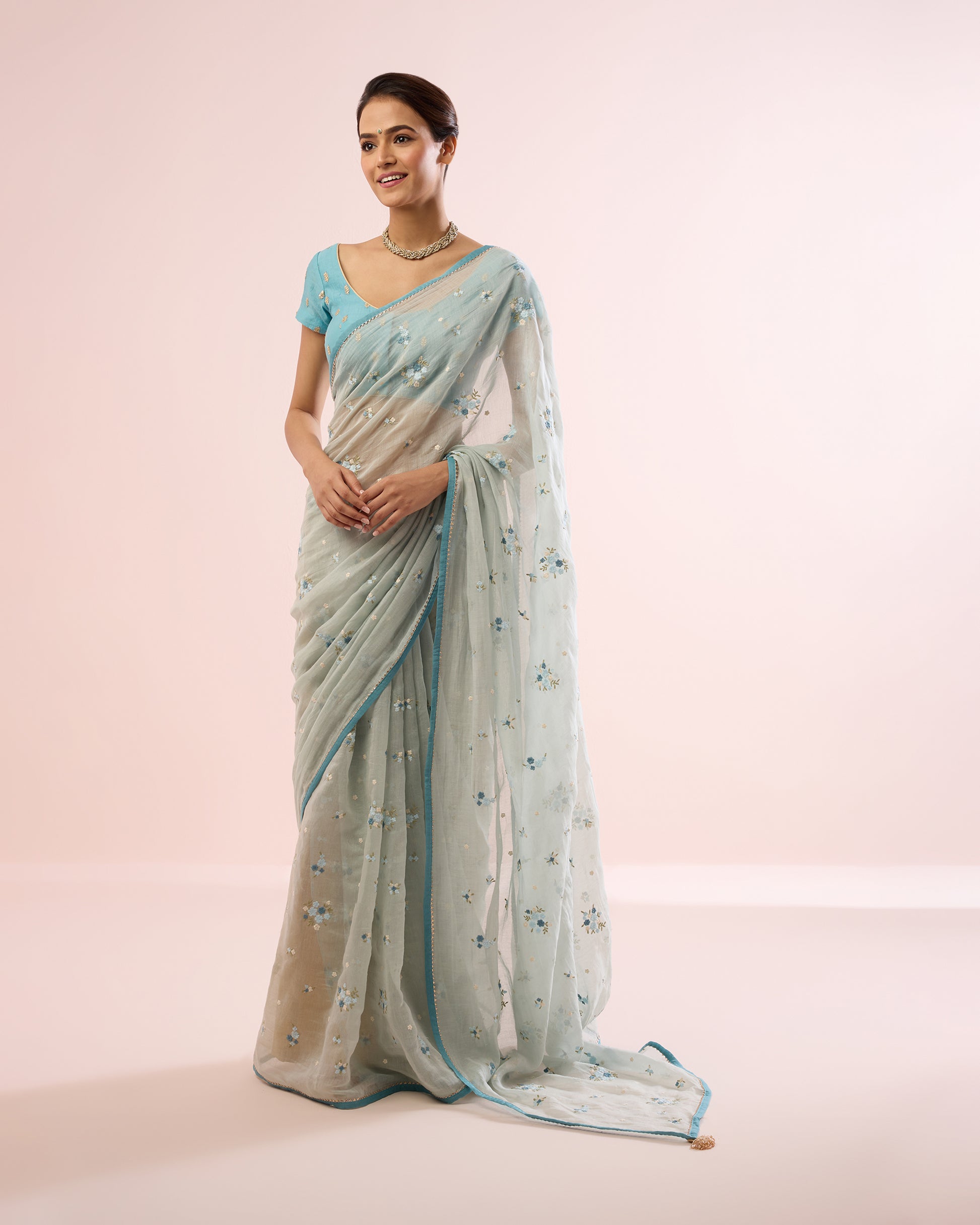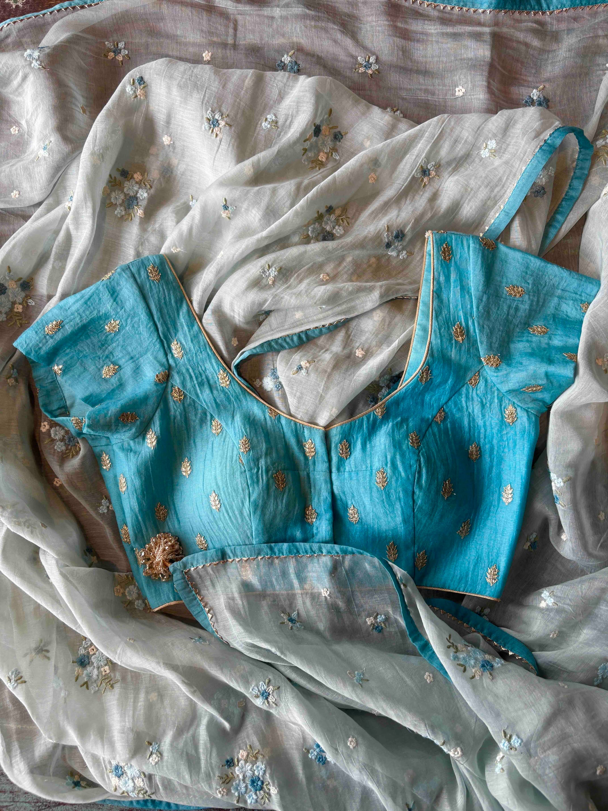 Paired with a vintage turquoise blouse fabric in embroidered Chanderi, featuring tiny sequinned leaves, the soft contrast enhances the pastel palette of the saree and completes the ensemble with quiet sophistication.