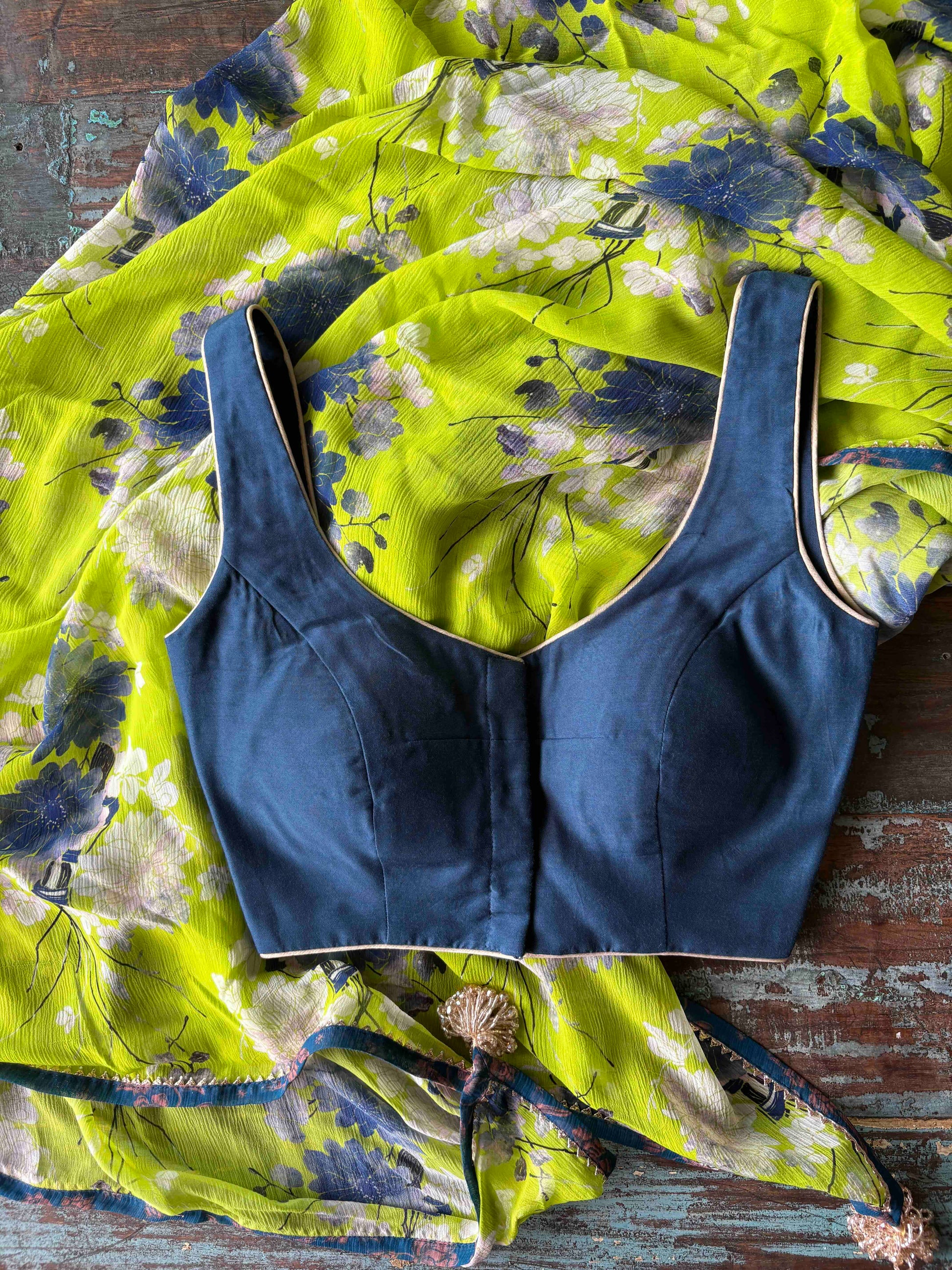 A bold and radiant saree where vibrant dahlias bloom across a lush lime green base, creating a canvas of wild floral energy. The soft, flowing chiffon adds a dreamy fluidity to the vivid palette, giving it a carefree yet elegant charm.