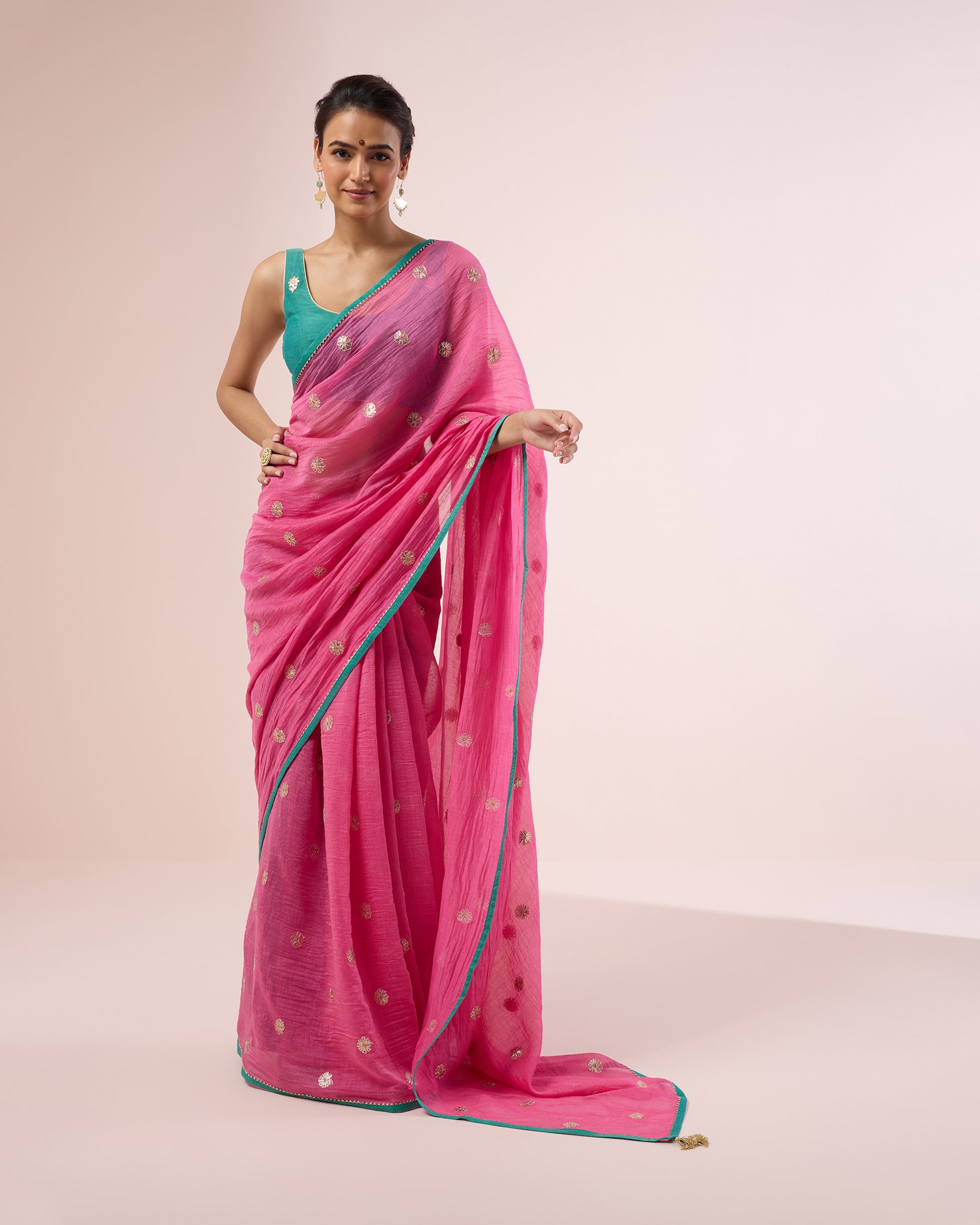 This candyfloss pink handwoven Chanderi silk saree is delicately embroidered with mogra florals in shimmering gold gota and metallic threads—an ode to timeless charm with a whisper of vintage glamour.