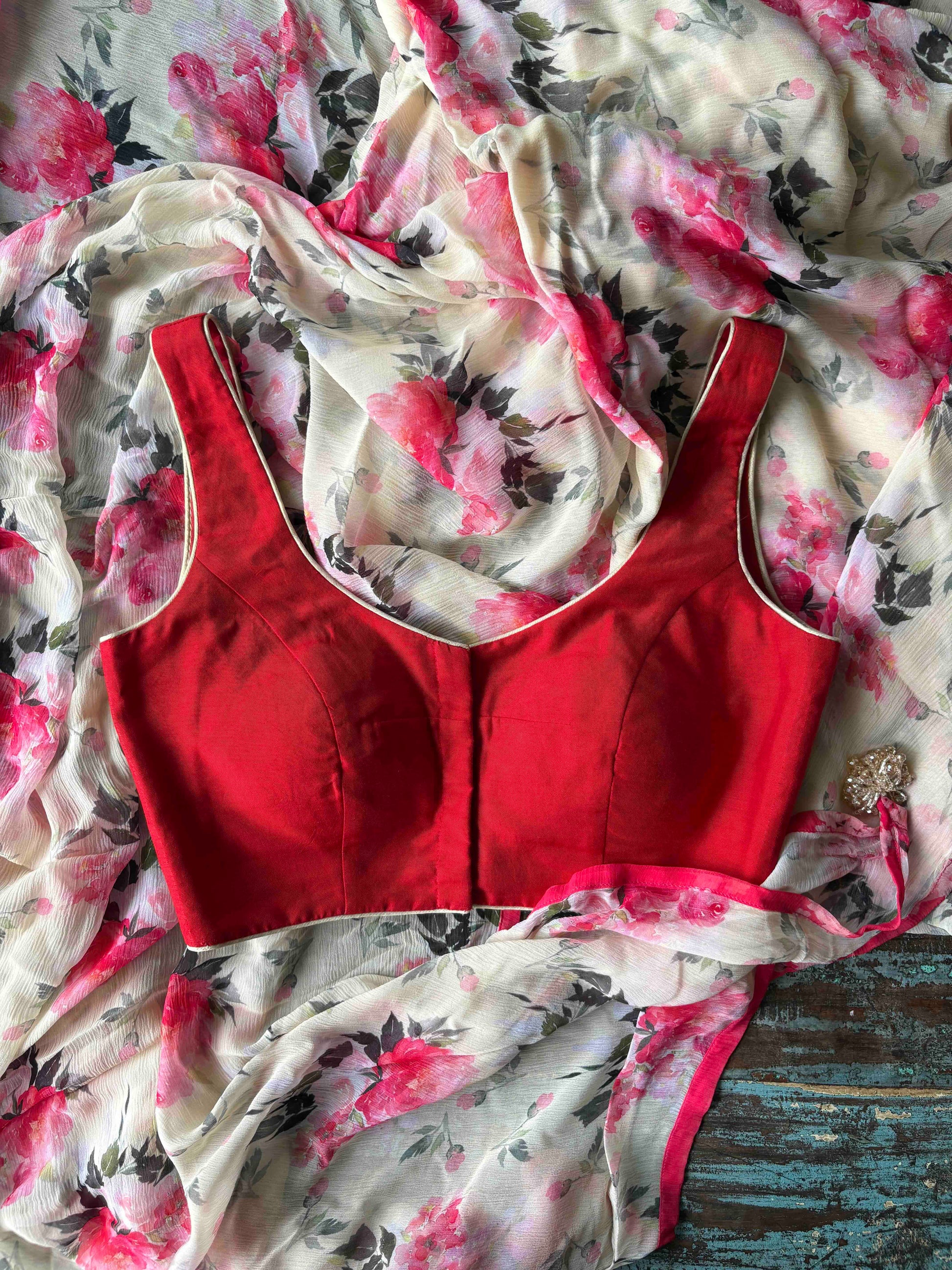 The saree is paired with an intense red cotton silk blouse fabric, adding a bold and striking contrast that enhances the overall look, making it contemporary yet classic.