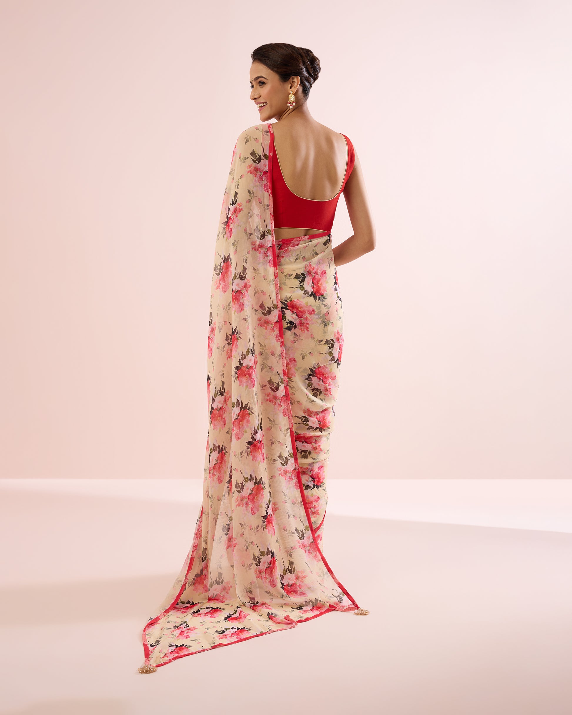Delicate watercolour carnations in soft pink hues bloom gracefully across a base of neutral sand chiffon, evoking the quiet elegance of a sun-drenched garden. The print is serene and timeless, with just the right hint of femininity. A contrasting printed edge completes the drape with finesse.