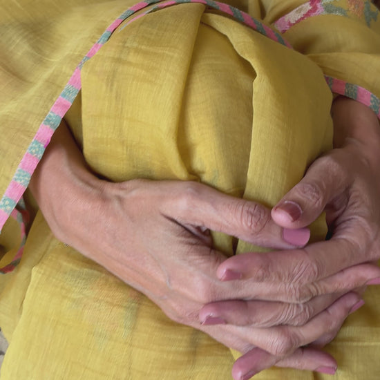The diaphanous Chanderi silk has a soft, fluid hand-feel, offering the richness of fine silk with a weightless grace that moves effortlessly with you. Every fold feels light, luminous, and quietly luxurious.