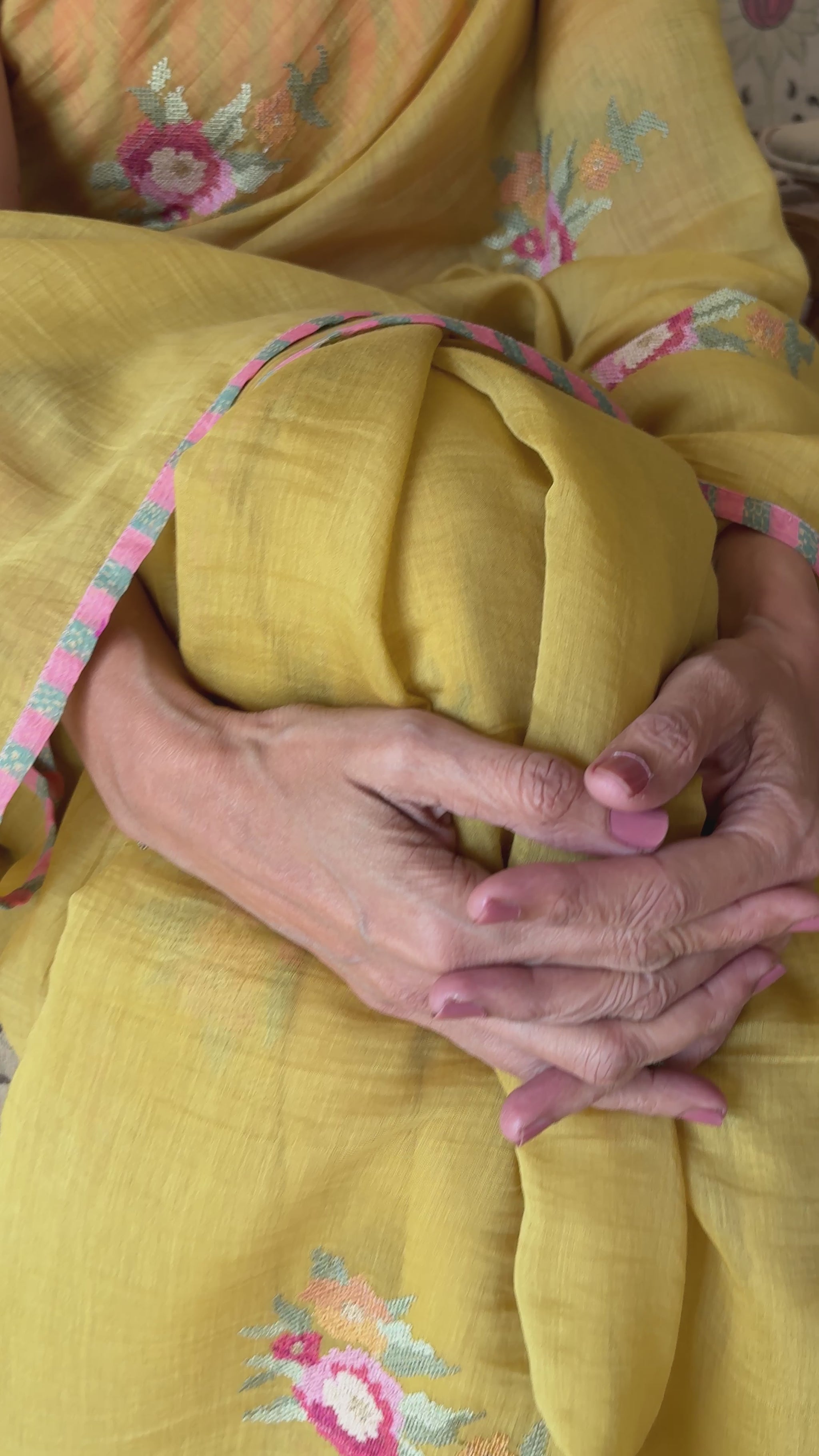 A pale-gold handwoven Chanderi becomes a canvas for delicately cross-stitched briar roses, scattered across the saree in soft, colourful threadwork that carries a gentle sense of nostalgia. The petit point–style embroidery brings a quiet intimacy to the fabric — intricate, romantic, and beautifully detailed.