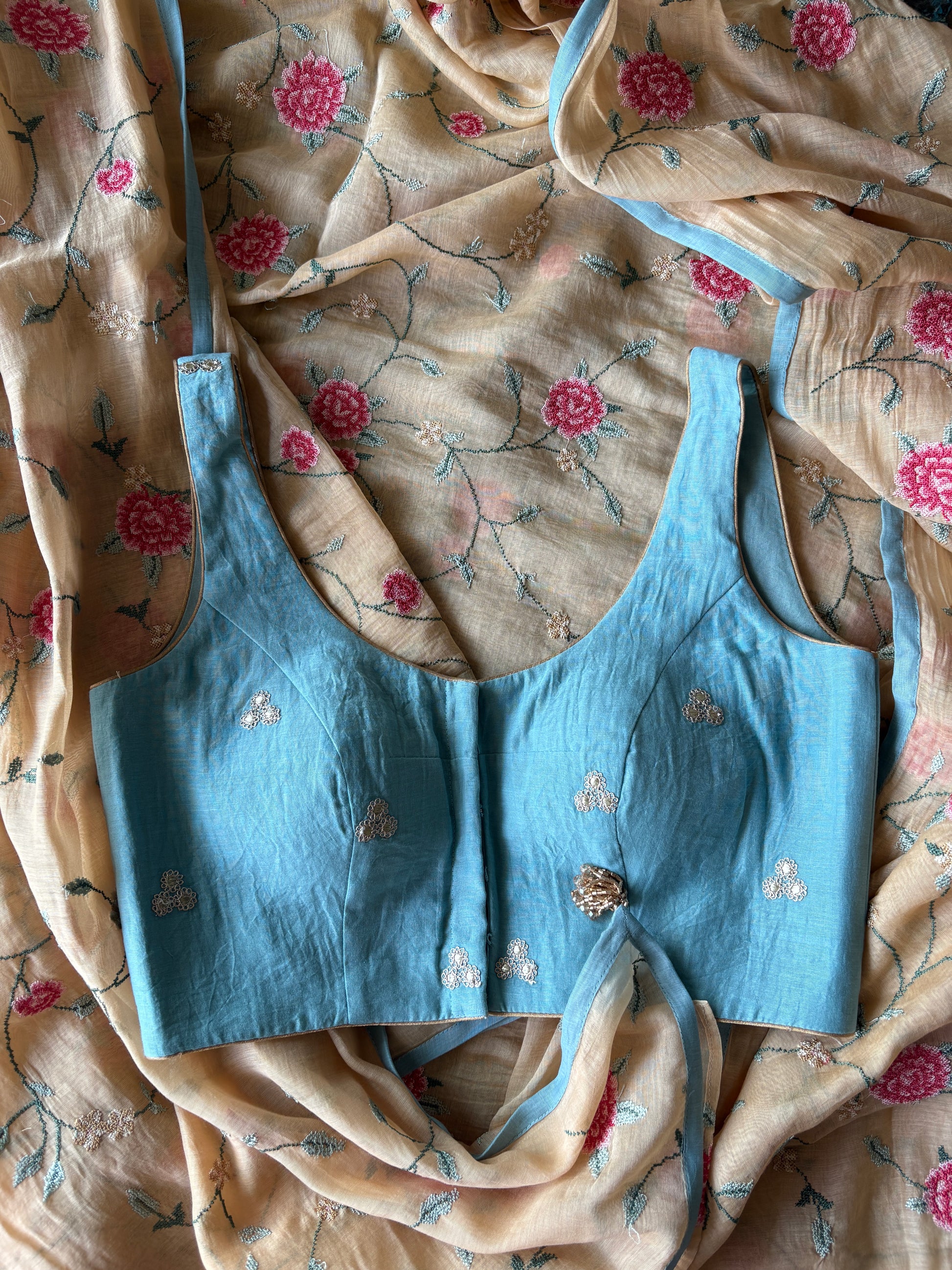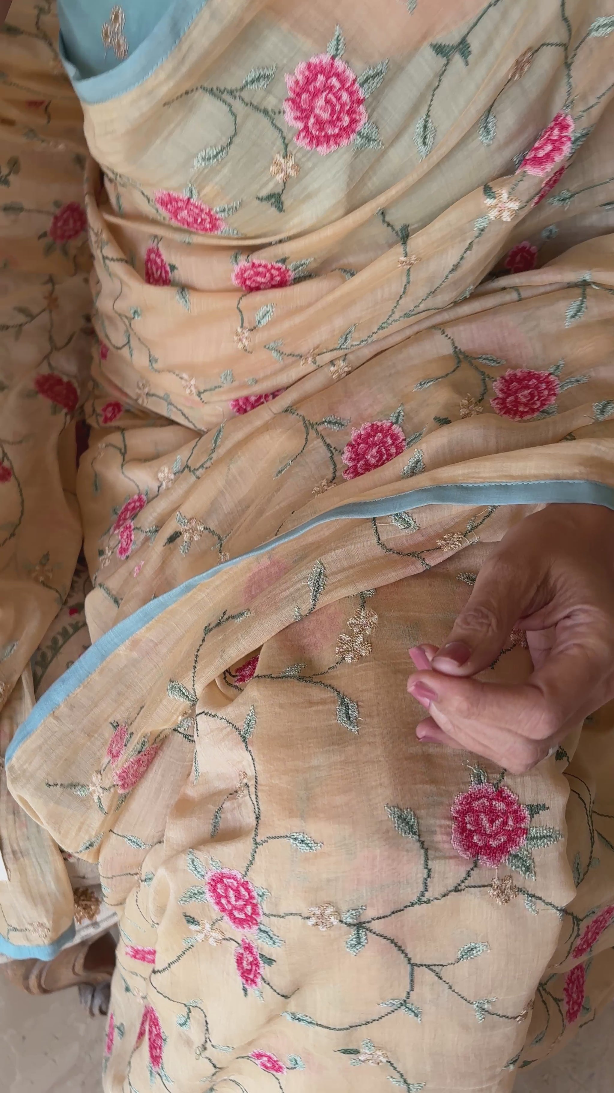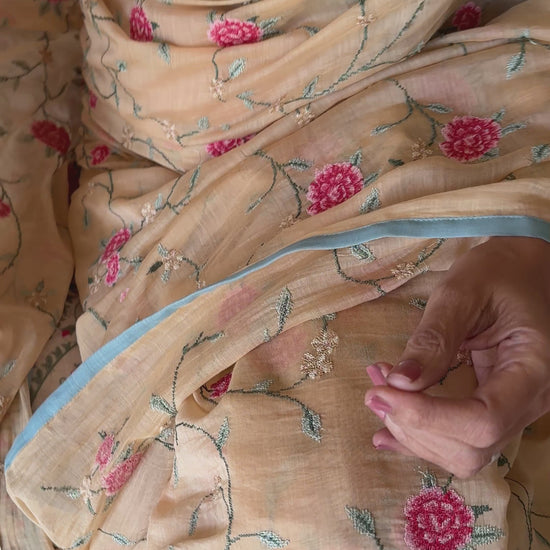 A soft blush-pink handwoven Chanderi becomes a canvas for cross-stitched roses climbing gently along delicate vines — scattered across the saree in colourful threadwork that feels tender, nostalgic, and almost storybook-like. The embroidery, done in the style of petit point, has the innocence of a child’s garden, where every rose feels lovingly placed.